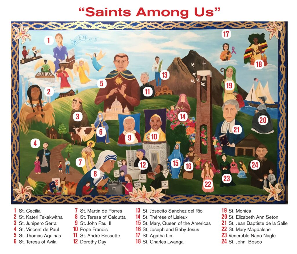 During the last school year, with the encouragement of St. Vincent de Paul Principal Gary Green; the parish pastor, Father John Norman; and Paula Smithson, an art teacher who also is the mother of a child enrolled in St. Vincent de Paul School, students in the middle school began drawings of 24 saints. Once the drawings were transferred to canvas, students in grades four through eight helped paint the outlines of the people and create the background. The painting was finished during the summer and presented to Fr. Norman and the parish community at Mass after the new school year began. The project now hangs in the parish’s Benvegnu Center, and the school has provided a legend that identifies the saints in the painting.