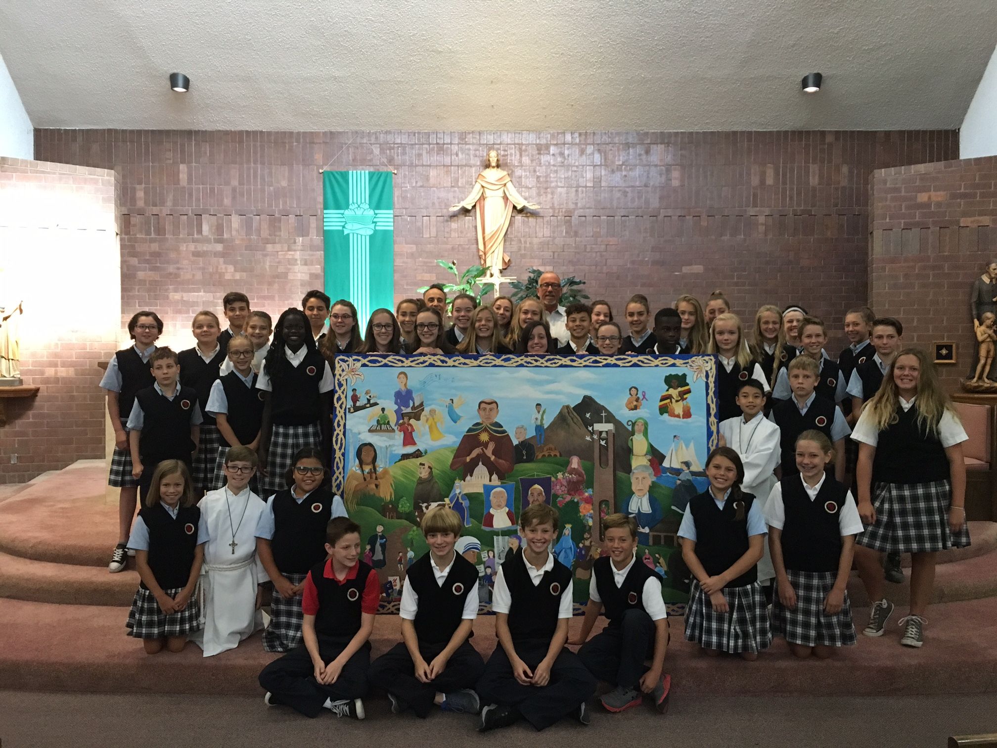 During the last school year, with the encouragement of St. Vincent de Paul Principal Gary Green; the parish pastor, Father John Norman; and Paula Smithson, an art teacher who also is the mother of a child enrolled in St. Vincent de Paul School, students in the middle school began drawings of 24 saints. Once the drawings were transferred to canvas, students in grades four through eight helped paint the outlines of the people and create the background. The painting was finished during the summer and presented to Fr. Norman and the parish community at Mass after the new school year began. The project now hangs in the parish’s Benvegnu Center, and the school has provided a legend that identifies the saints in the painting.
